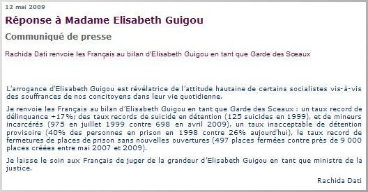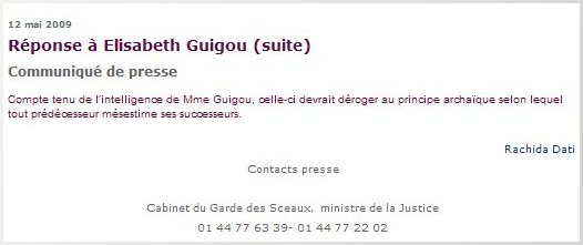 Mais ne lui en déplaise, Frédéric Lefebvre ne fera certainement pas la Une des gazettes pour cette boutade. Car Rachida Dati a fait fort, très fort. La garde des Sceaux n’a semble-t-il pas goûté la prestation d’Élisabeth Guigou, mardi matin au micro d’Europe 1. L’ancienne ministre de la Justice y avait osé affirmer que Rachida Dati avait « gâché toutes ses chances » au ministère de la Justice, par « désinvolture« , « autoritarisme » et « incompétence« . « J’avais beaucoup de sympathie et d’estime pour elle, c’est fini » a-t-elle ajouté. En moins de 90 minutes et deux communiqués de presse d’une solennité sans égal, l’accusée lui aura prouvé la réciproque. Tout ce qu’il y a de plus officiel, malgré les apparences…