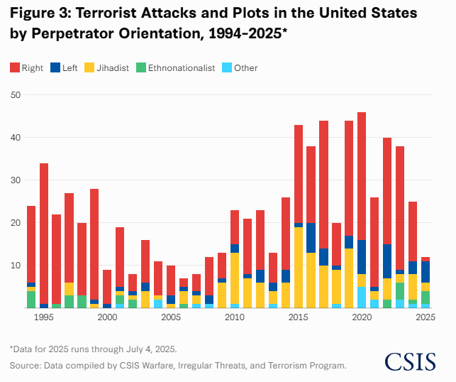 Ah… au fait, un détail… Le CSIS (Center for Strategic and International Studies) compile des données sur les attaques et complots terroristes aux États‑Unis (725 événements entre 1994 et le 30 avril 2024).