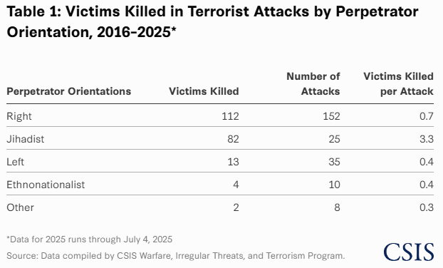 Et voici le résultat (csis.org) : entre 2016 et 2025, le terrorisme d’extrême droite a tué 112 fois lors de 152 attaques, contre 13 fois lors de 35 attaques pour l’extrême gauche.